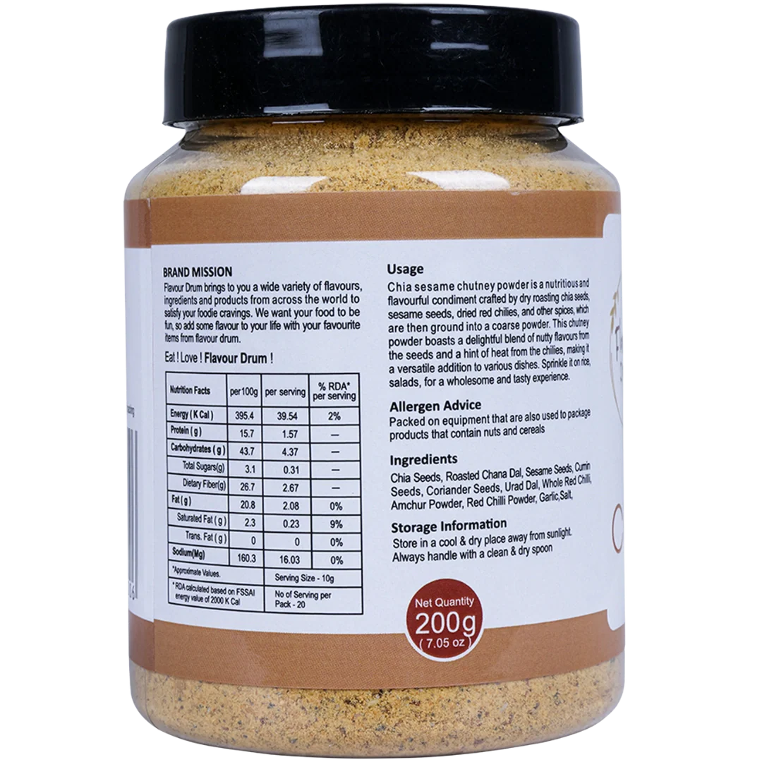 About this item A wholesome blend of chia seeds and sesame for rich taste and nutrition. Ideal side for idli, dosa, paratha, rice, and other Indian meals. Ready-to-use chutney powder that enhances flavor with every spoonful. Ingredients Chia Seeds, Sesame Seeds, Roasted Chana Dal, Red Chilli, Garlic, Salt, Cumin, Curry...
